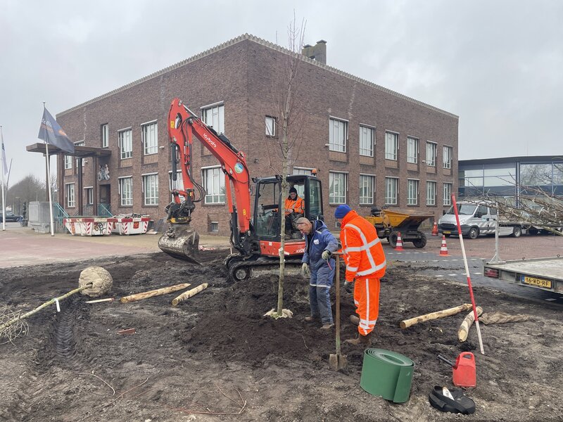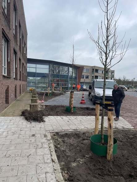 Er is hard gewerkt en de bomen en planten staan in de groenvakken bij de parkeerplaatsen.